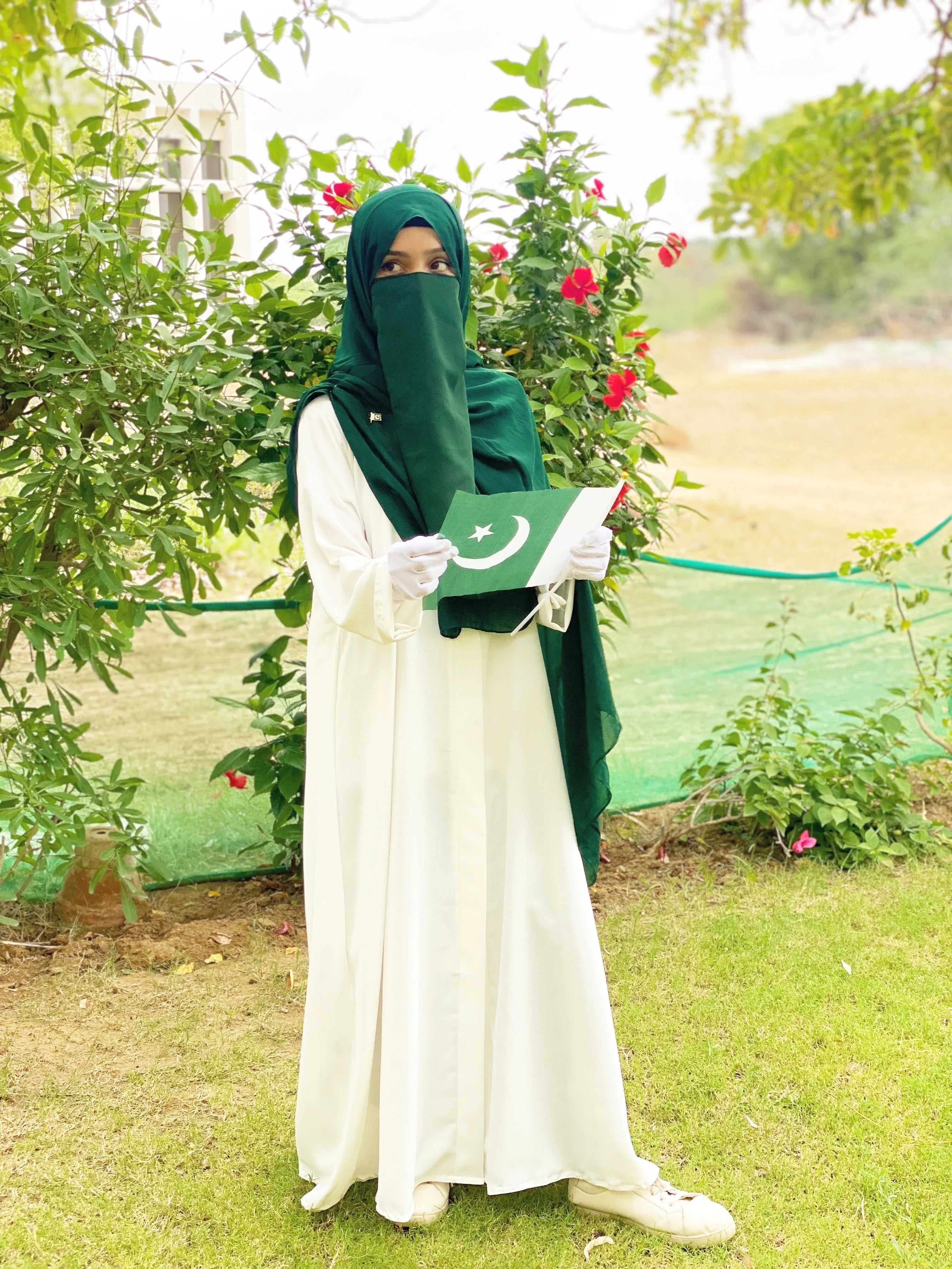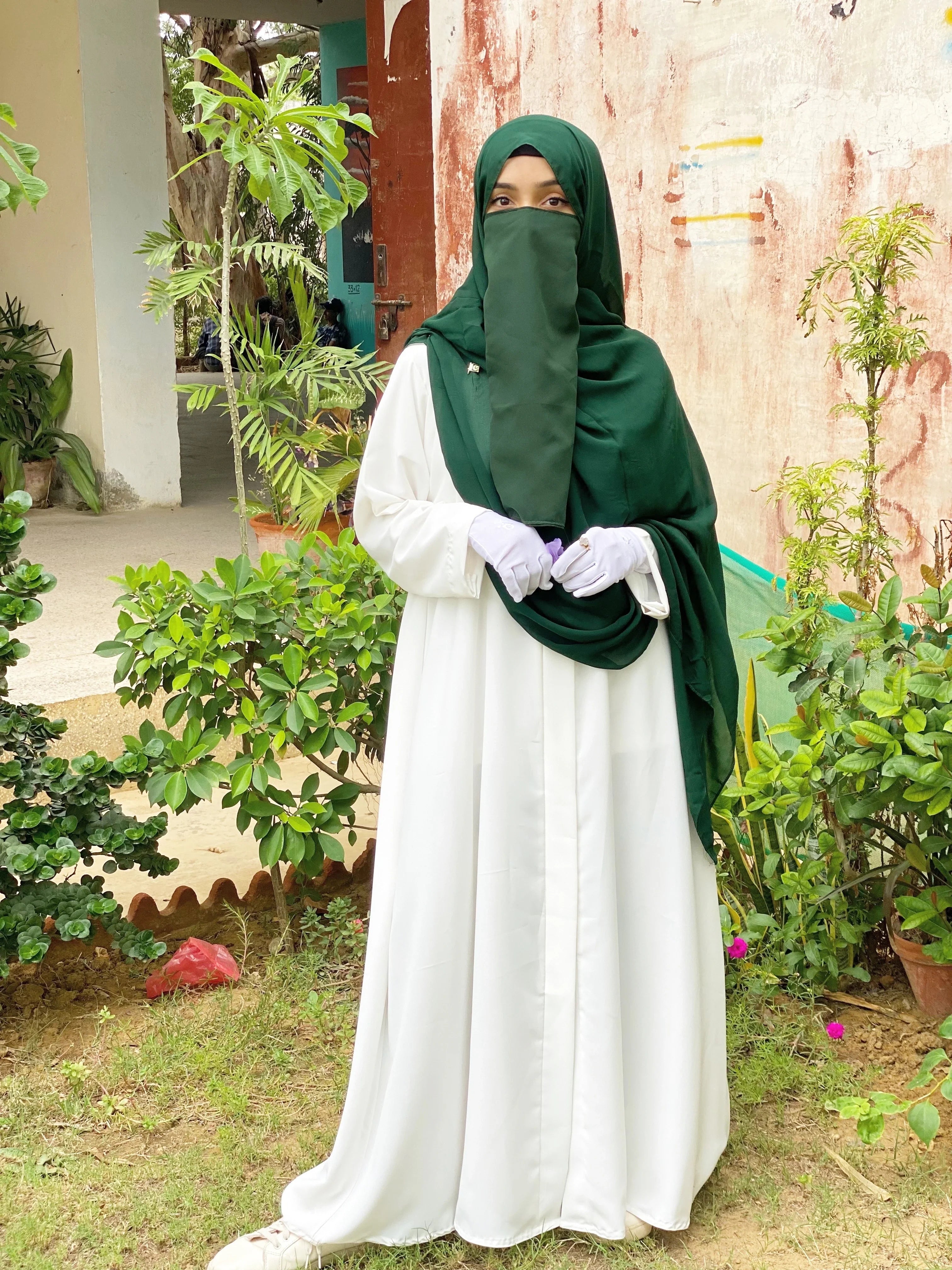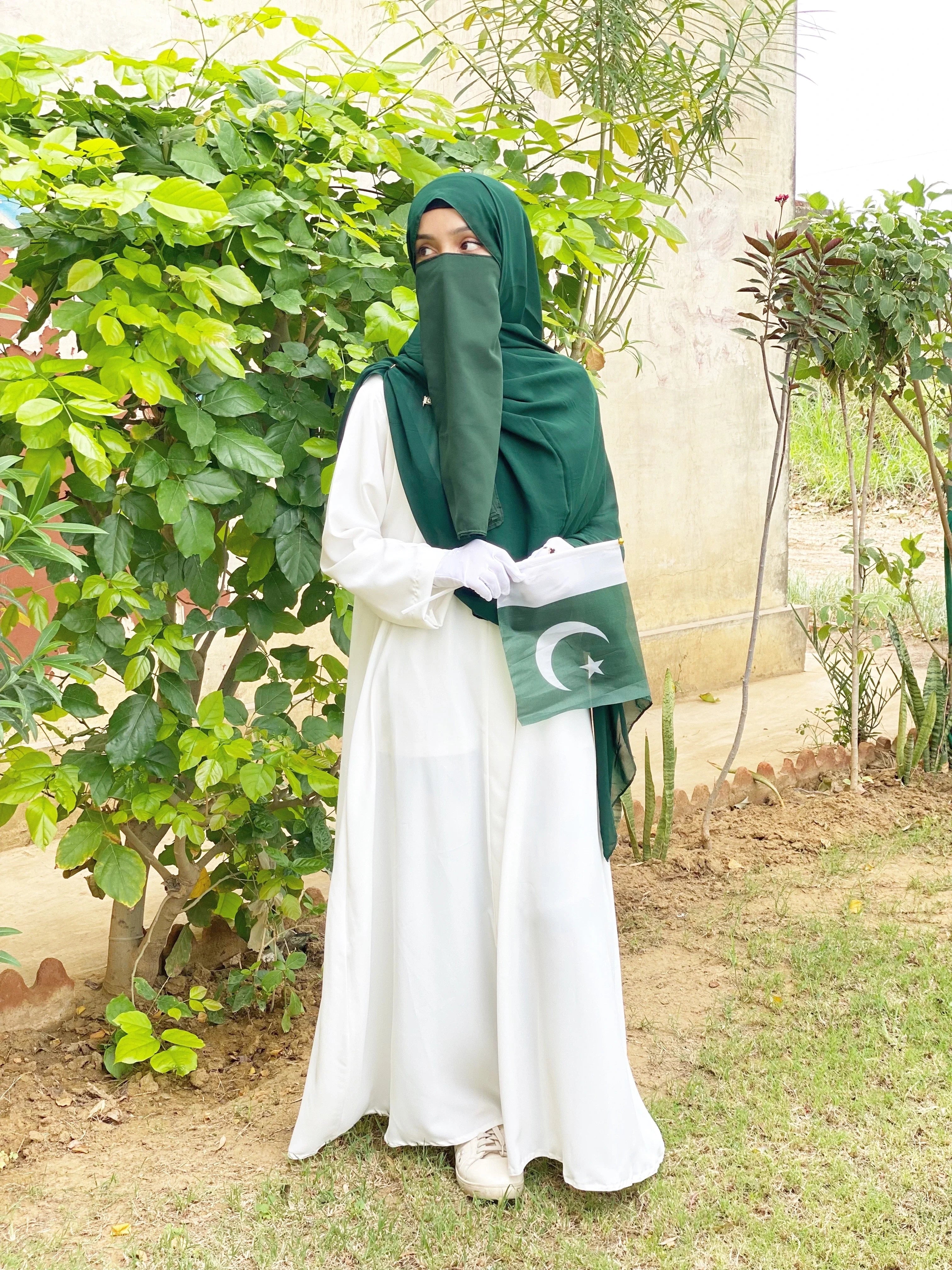Additional Description: DESCRIPTION Comes in a selection of lengths & size. Imported Wrinkled Nada Fabric. Summer Friendly fabric. Item is without Scarf. Do not bleach. Do not Tumble Dry. Do not Machine Wash. DISCLAIMER Product color may slightly vary due to photographic lighting sources or your monitor setting Mentioned price is only for White Abaya+Green Scarf +14 Aug Gift. Other coordinates such as Scarf, Slip dress, Trouser, Clutch etc. has separate prices.