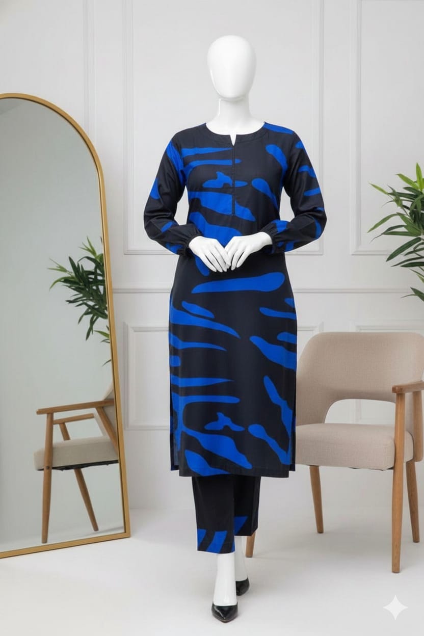 Imported crepe digital 2-piece suit with a stylish long shirt, matching plazo. Made from soft imported crepe fabric, offering a graceful fall and comfortable wear. Ideal for casual and semi-formal occasions.